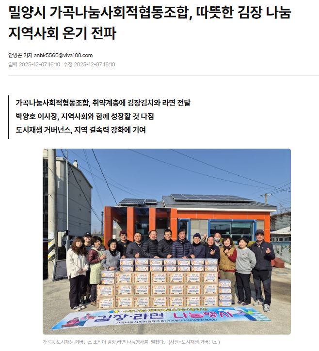 | [브릿지경제] 밀양시 가곡나눔사회적협동조합, 따뜻한 김장 나눔 지역사회 온기 전파 | |||