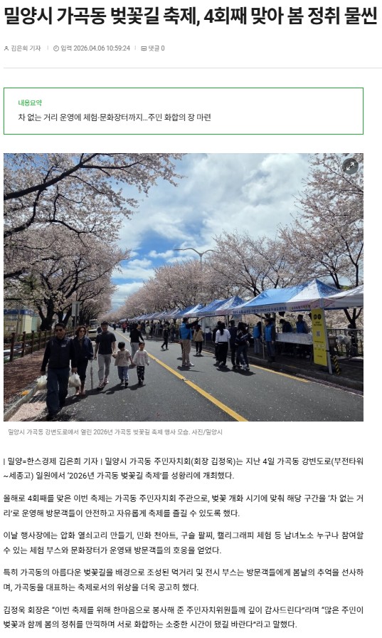 밀양시 가곡동 벚꽃길 축제, 4회째 맞아 봄 정취 물씬 < 뉴스 < 부산·경남 < 전국 < 기사본문 - 한스경제