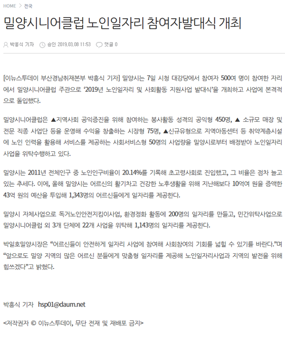 | [이뉴스투데이] 밀양시니어클럽, 노인일자리 참여자 발대식 개최 | |||