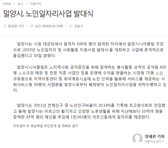 [경남매일신문] 밀양시, 노인일자리사업 발대식