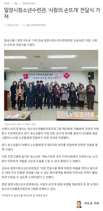 | [일요서울] 밀양시청소년수련관, '사랑의 손뜨개'전달식 가져 | |||