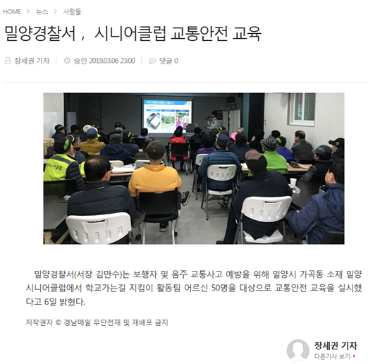 | [경남매일신문] 밀양경찰서, 시니어클럽 교통안전교육 | |||