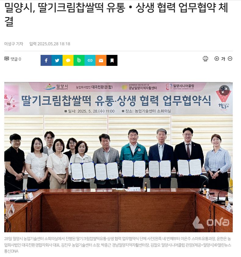 밀양시, 딸기크림찹쌀떡 유통‧상생 협력 업무협약 체결 < 부산/울산/경남 < 전국 < 기사본문 - 열린뉴스통신
