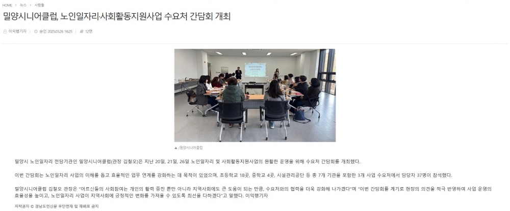 밀양시니어클럽, 노인일자리·사회활동지원사업 수요처 간담회 개최 - 경남도민신문