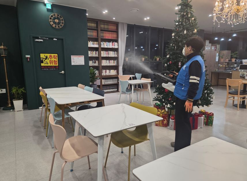 우리 밀양시니어클럽에서는 상상어울림센터 건물 방역 실시
